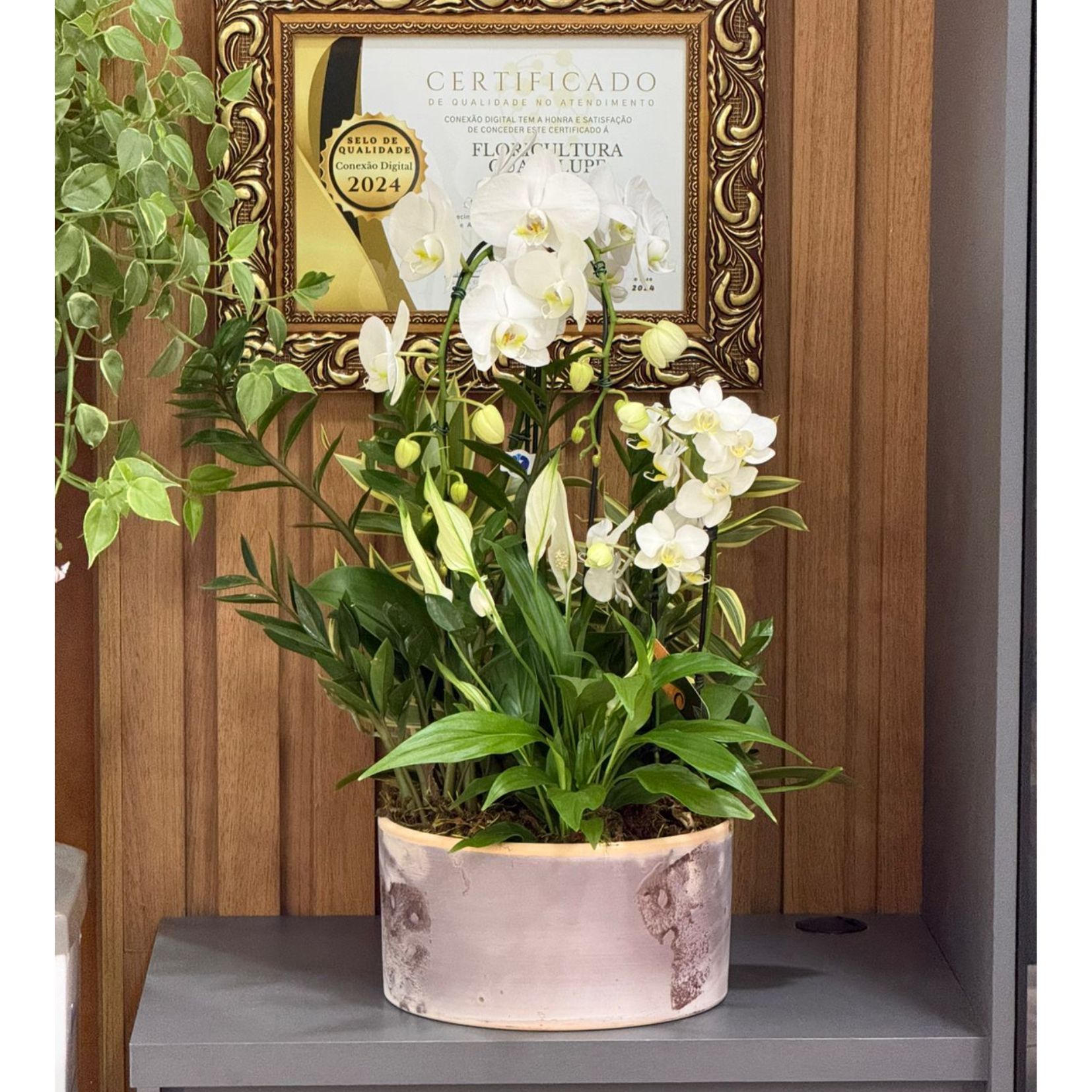 Arranjo de orquídeas em bacia composto por 1 orquídea, 1 mini orquídea, 1 zamiolcuca, 1 mini antúrio e dracenas