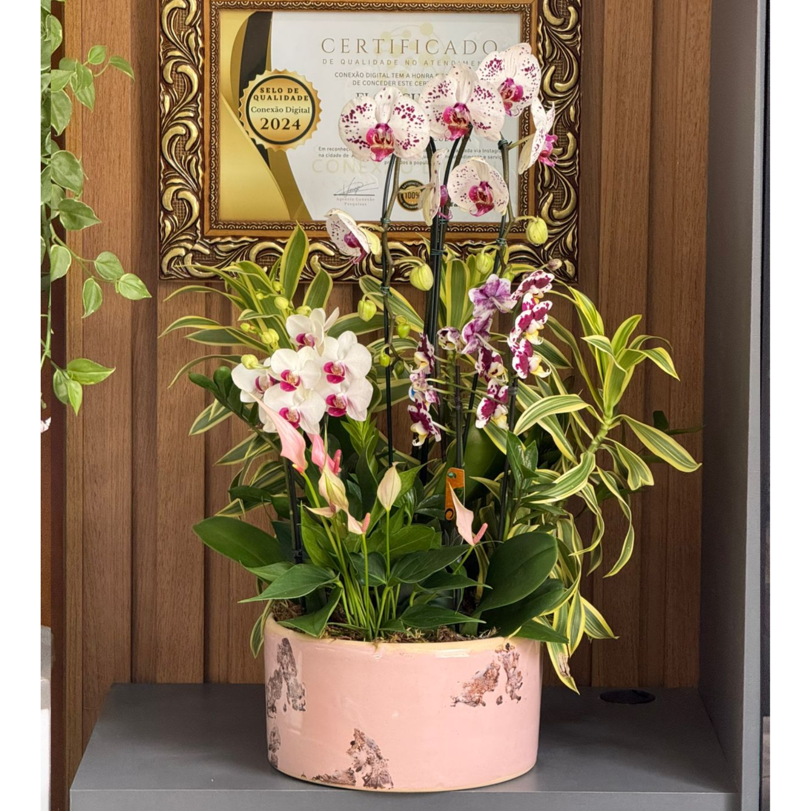 Arranjo de orquídea em bacia composto por 1 orquídea, 2 mini orquídea, 1 mini antúrio, 1 zamiolcuca e dracenas