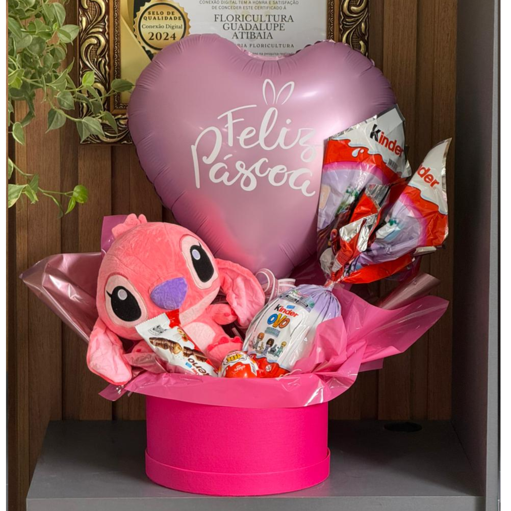 Box luxo composto por pelúcia angel, kinder joy, ovo de páscoa e kinder bueno