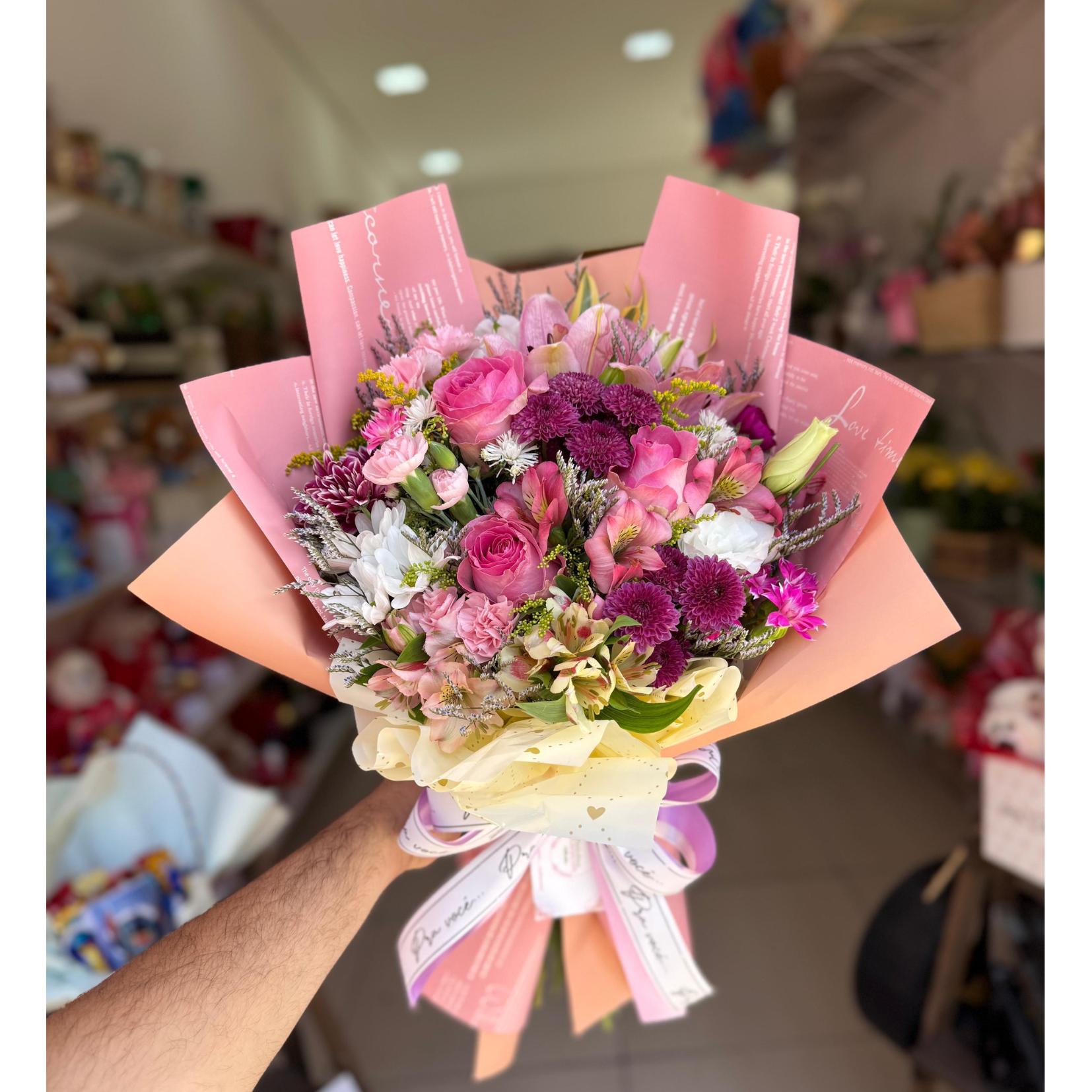 Buquê de flores do campo mistas em tons de cor de rosa em embalagem coreana de luxo
