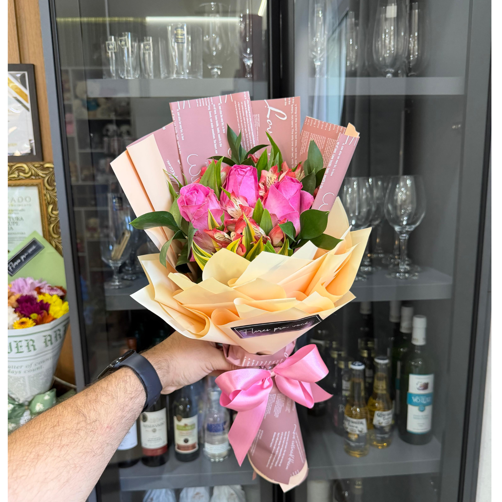 Mini buquê coreano composto por 3 rosas cor de rosa
