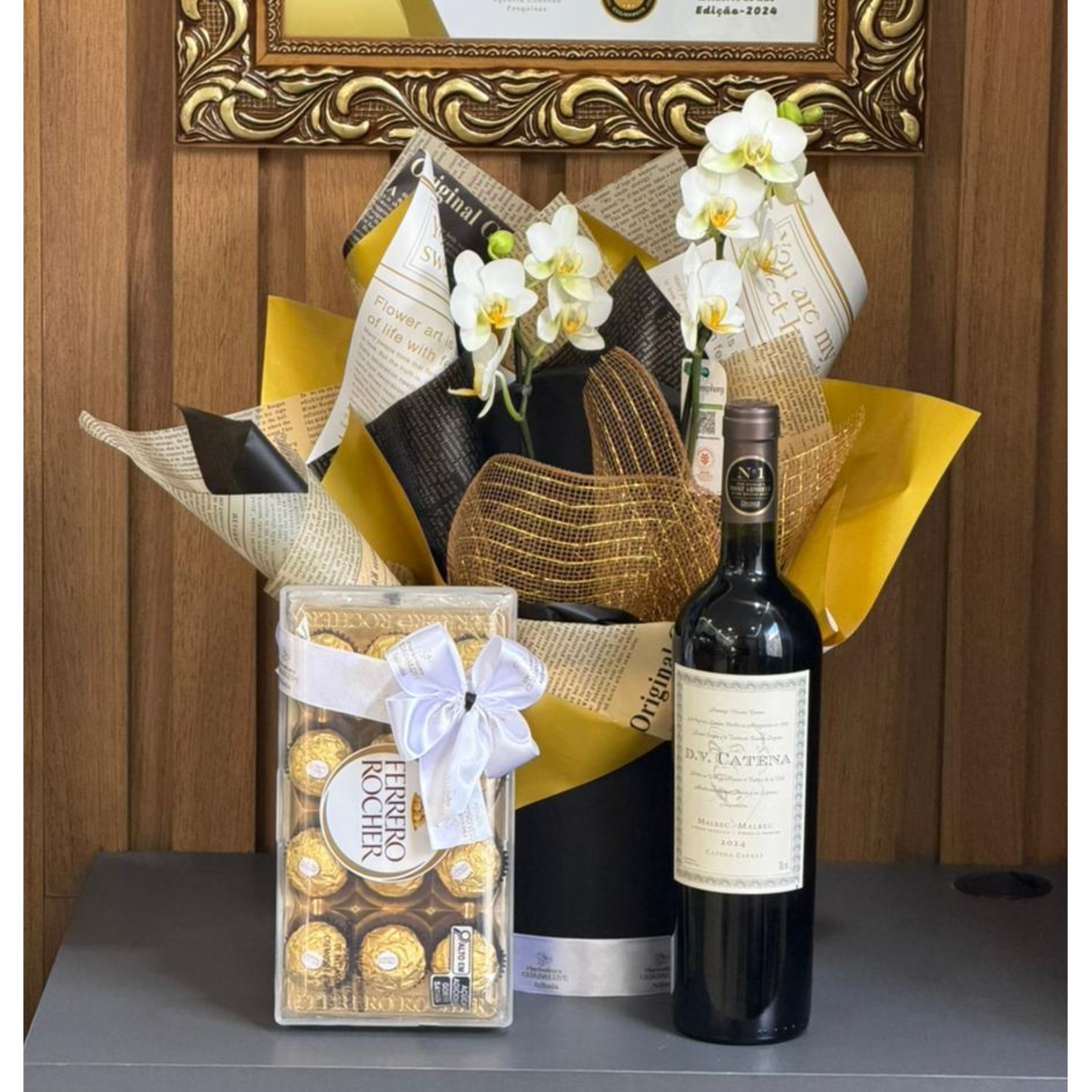 Kit box luxo, composto por mini orquídea em box luxo, vinho DV Catena (malbec-malbec) e ferrero rocher 12un