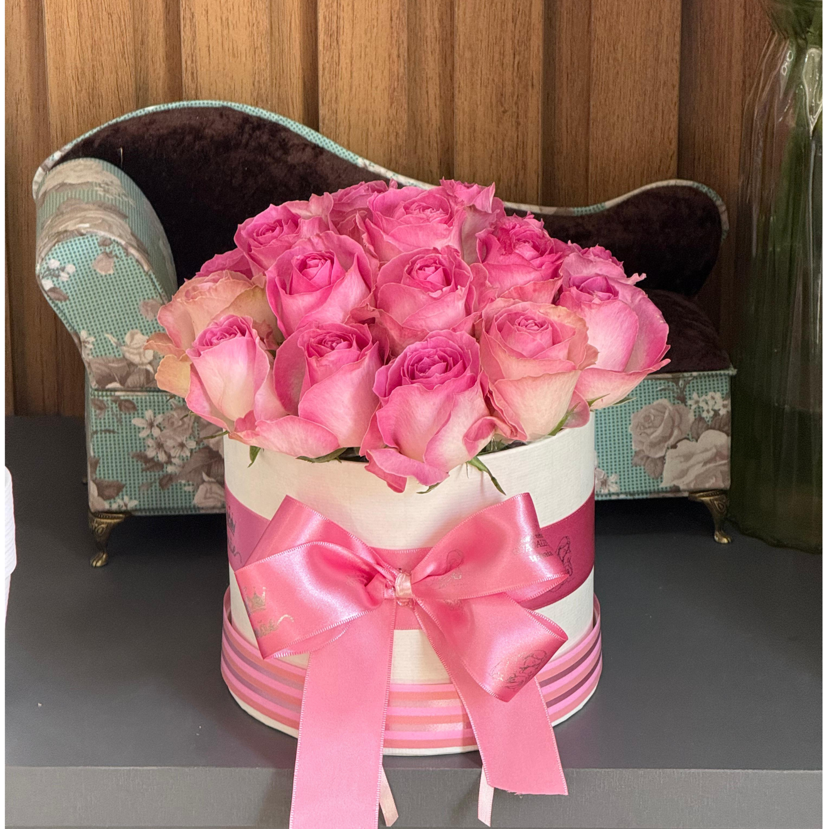 Box composto por 20 rosas cor de rosas em embalagem de luxo