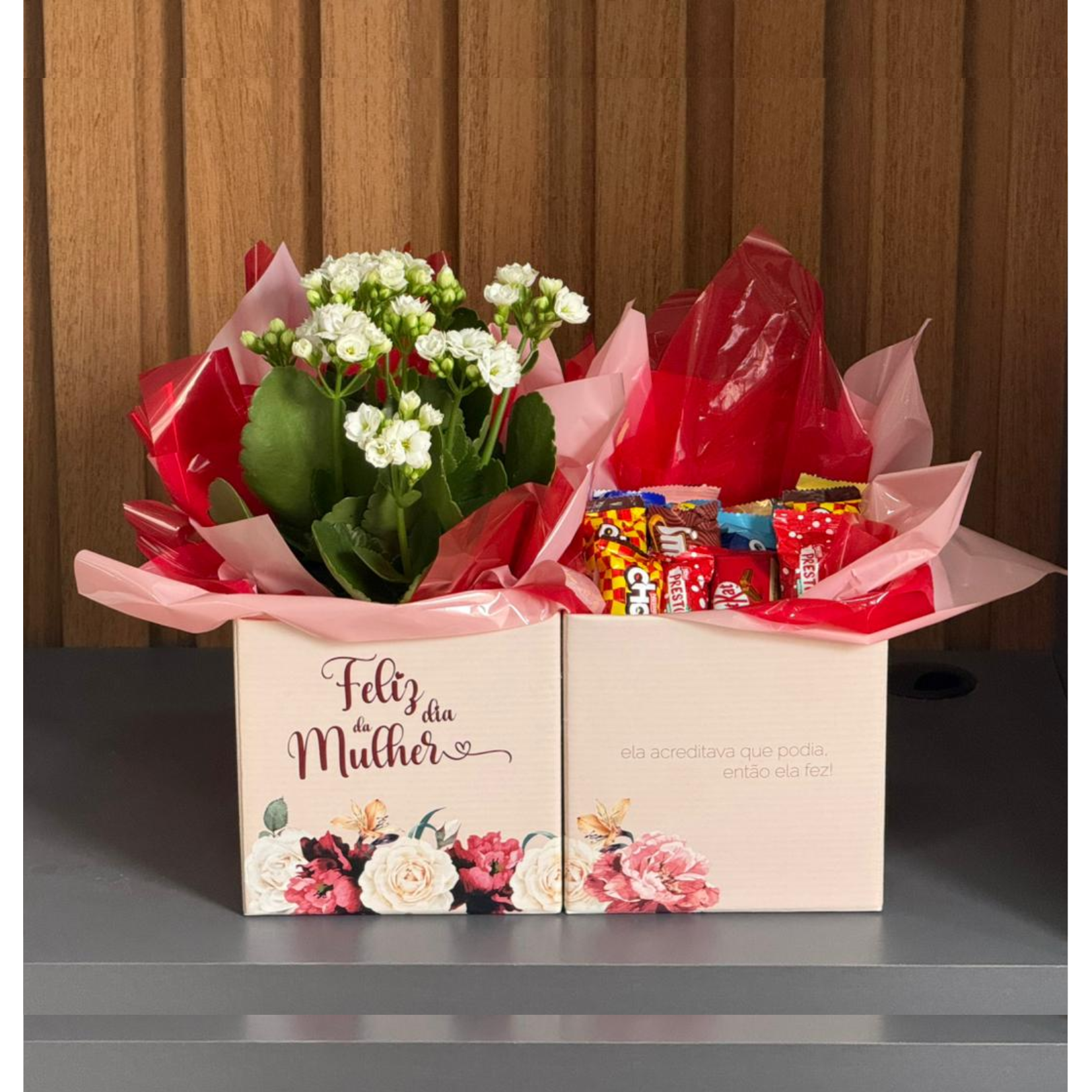 Box duplo composto por kalanchoe e bombons sortidos
