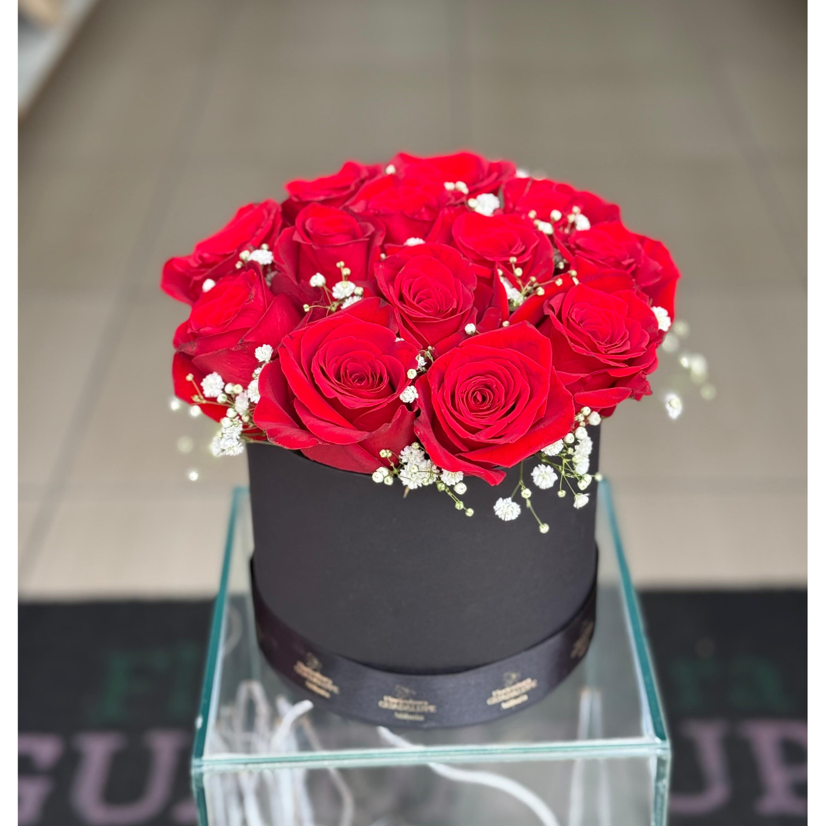 Box de luxo composto por 13 rosas vermelhas e flores adicionais em embalagem de luxo