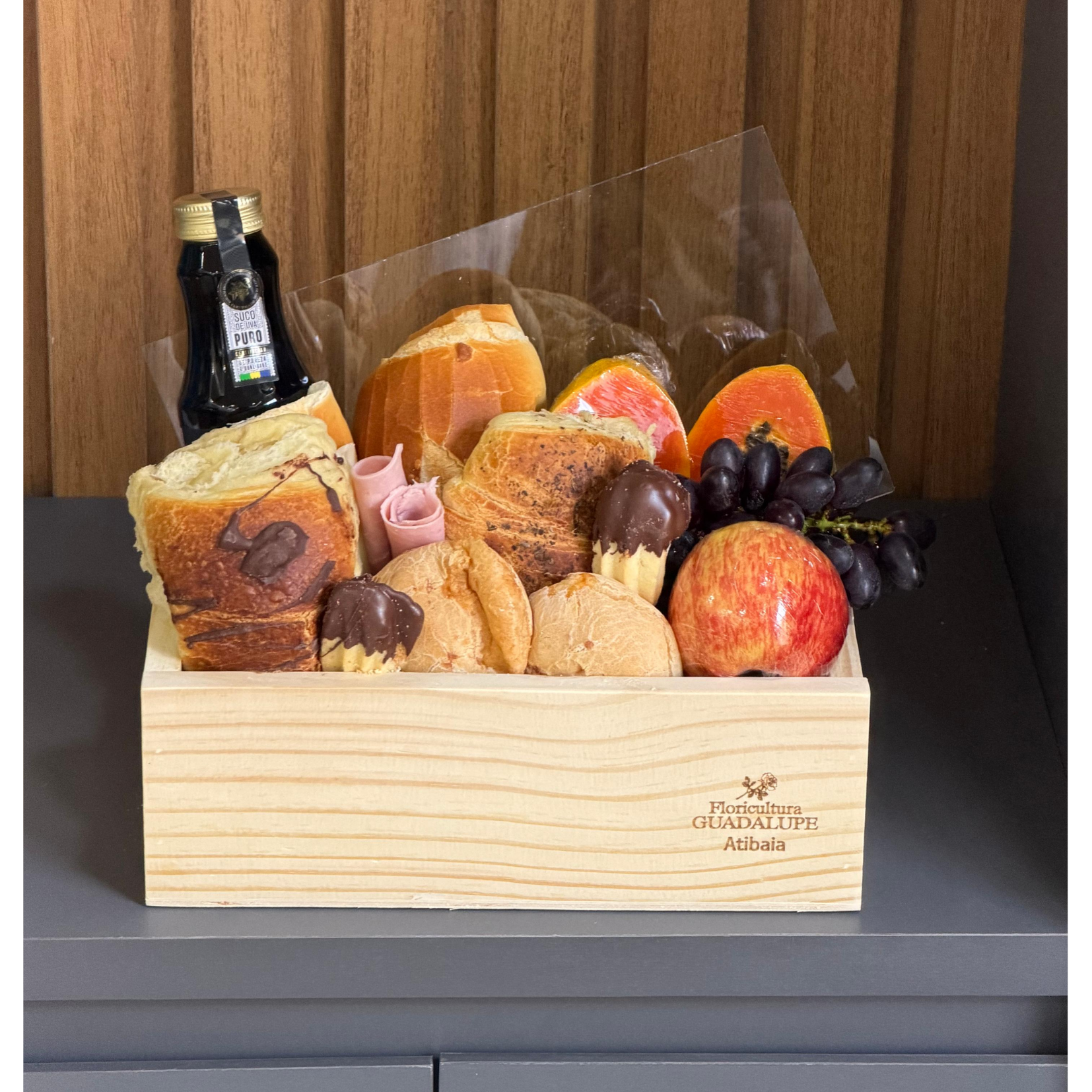 pão francês. croissant salgado, croissant doce, pão de queijo, carolinas, frios (presunto e mussarela), suco de uva integral, uva, mamão e maçã