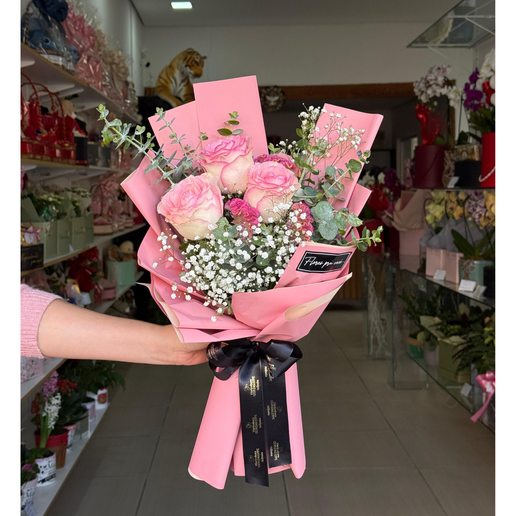 Buquê com 3 rosas cor de rosa e demais flores em embalagem coreana de luxo