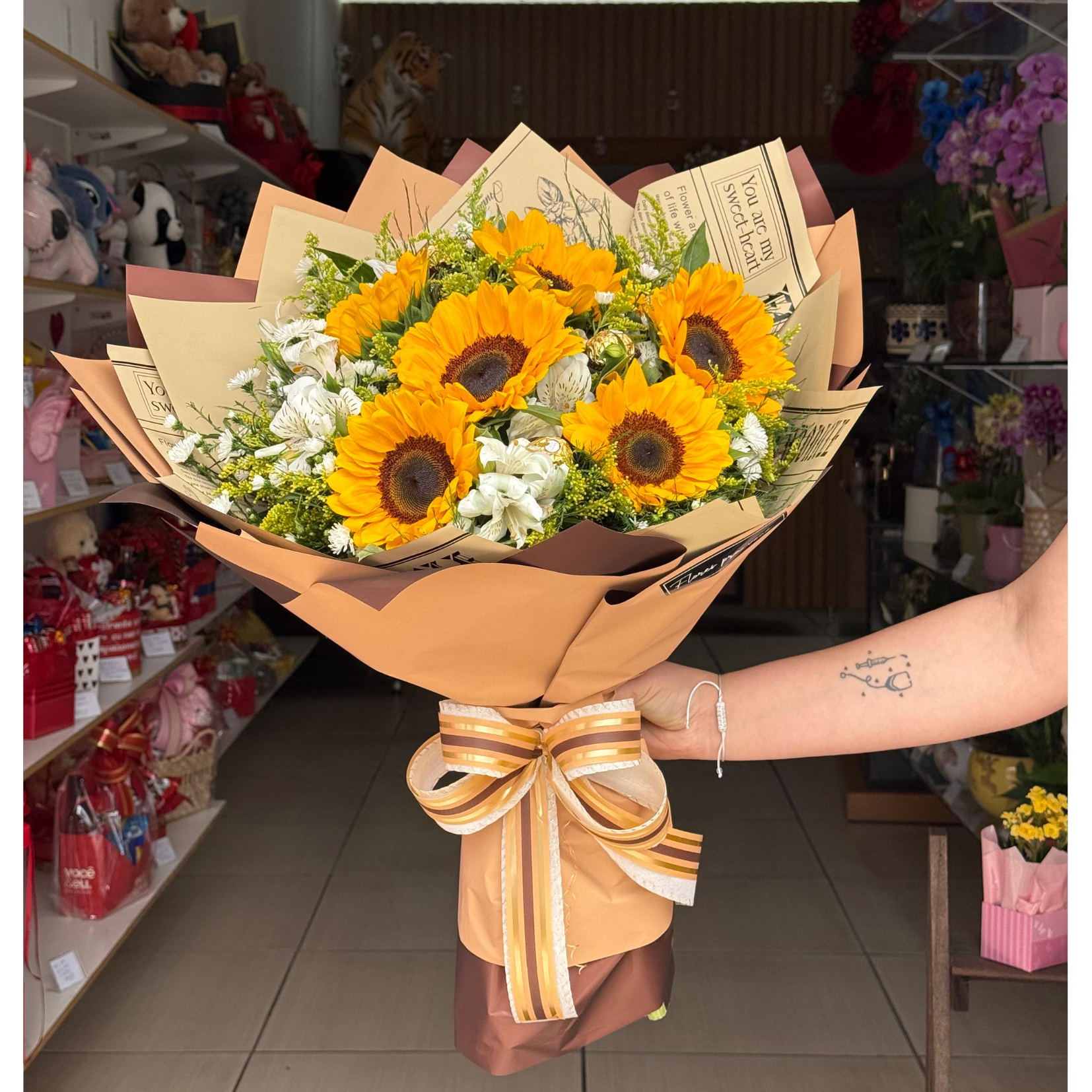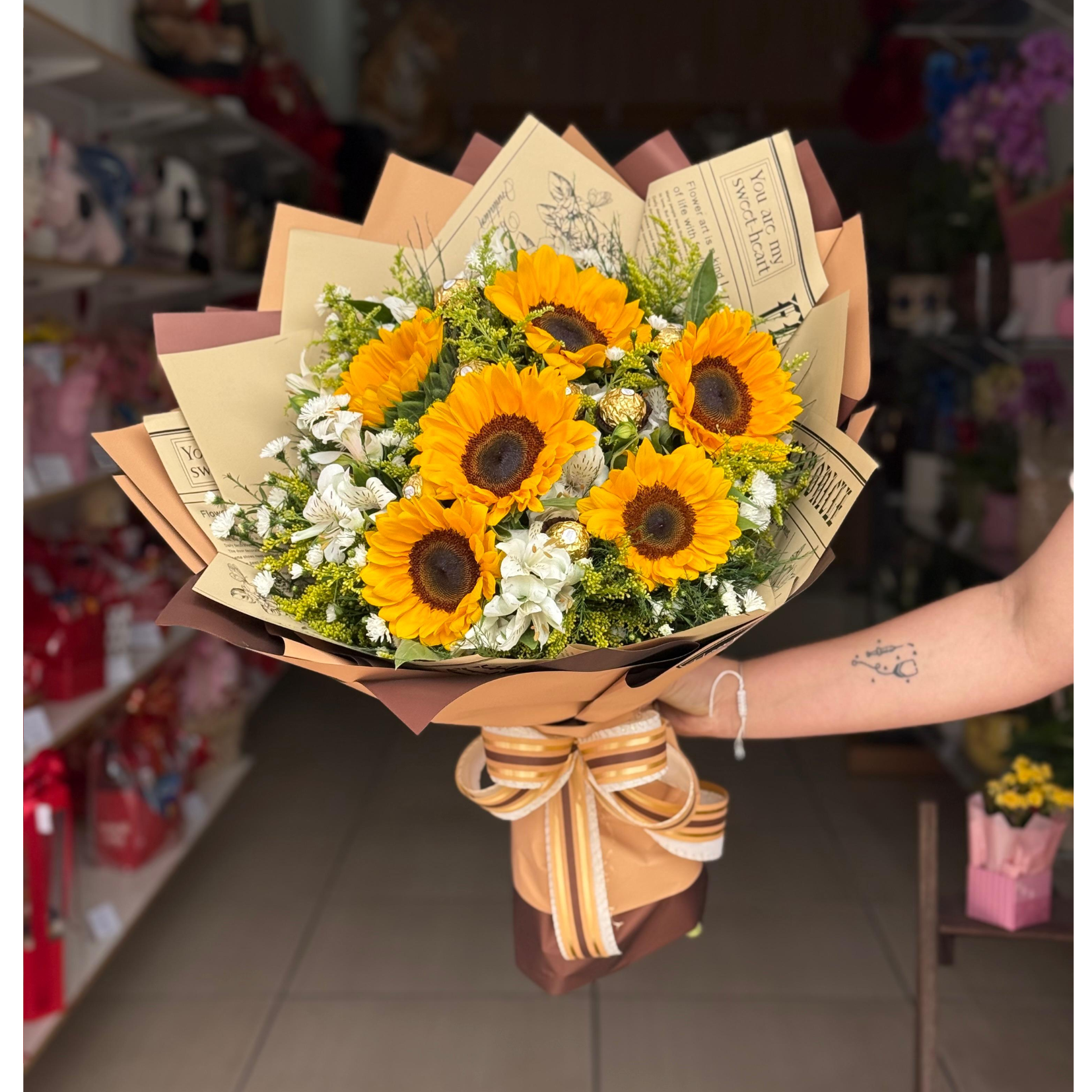 Buquê de 6 girassóis com demais flores em embalagem de luxo e bombons ferrero rocher