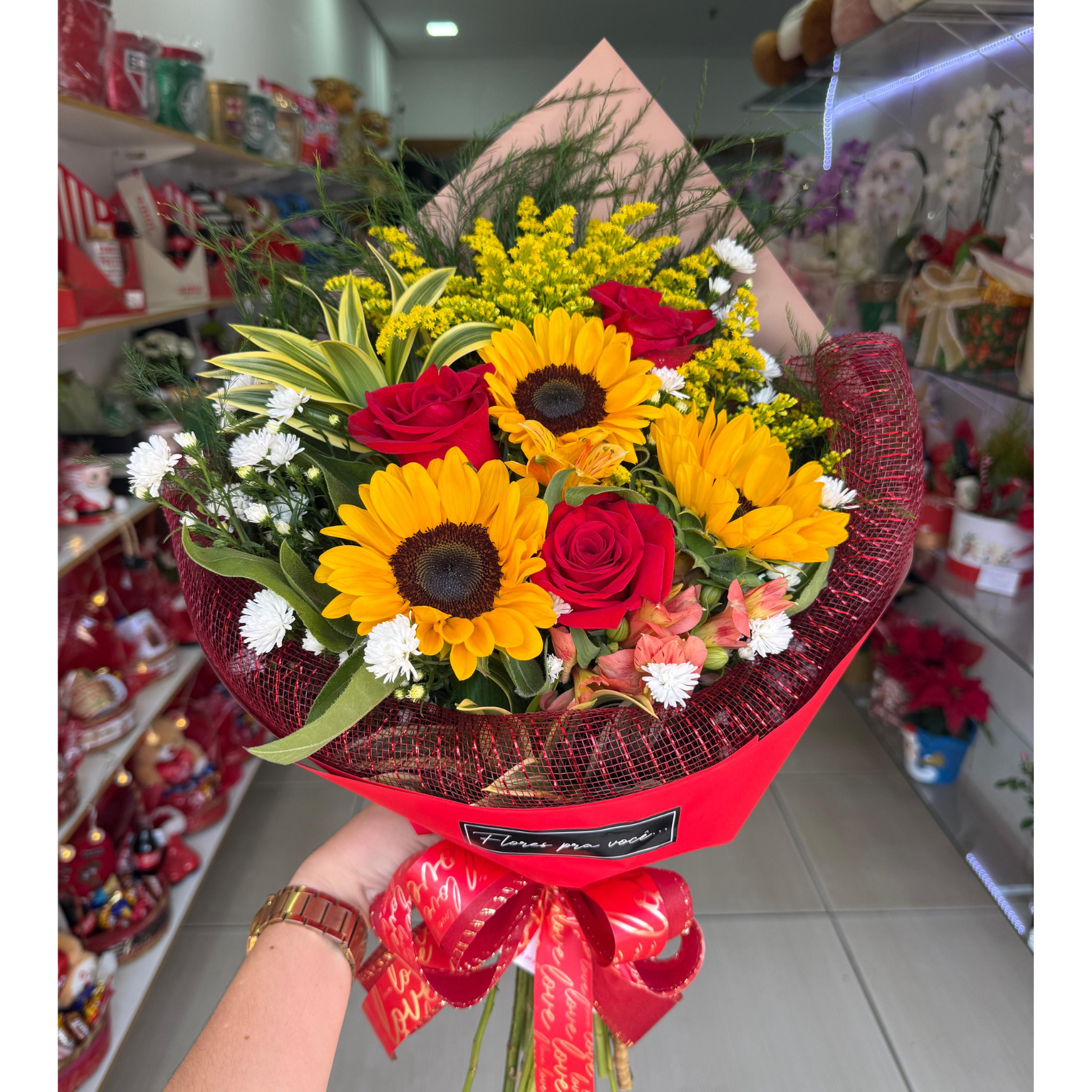 Buquê composto por 3 girassóis e 3 rosas vermelhas com demais flores em embalagem desconstruída
