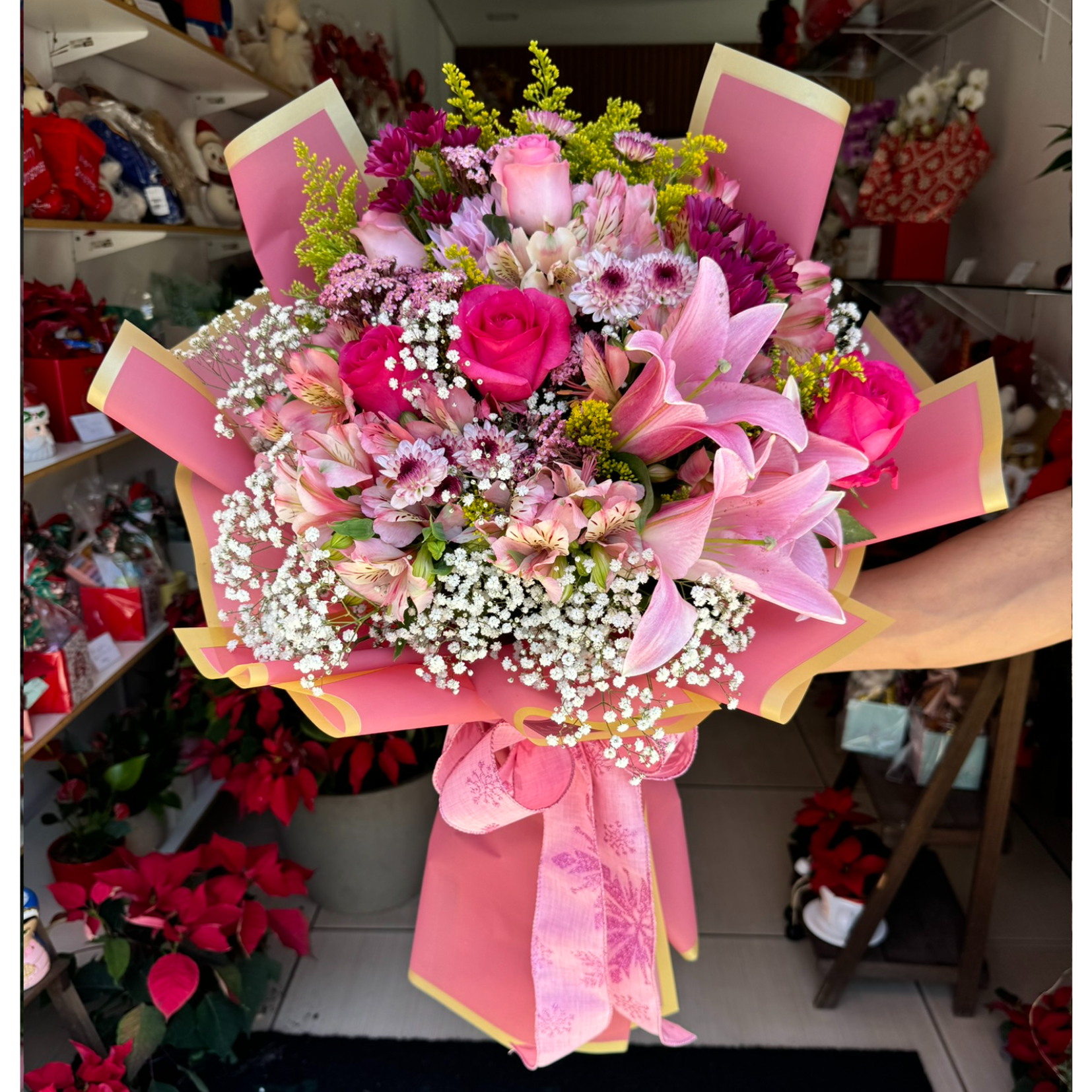 Buquê de flores mistas e lírios em tons de rosa em embalagem coreana de luxo