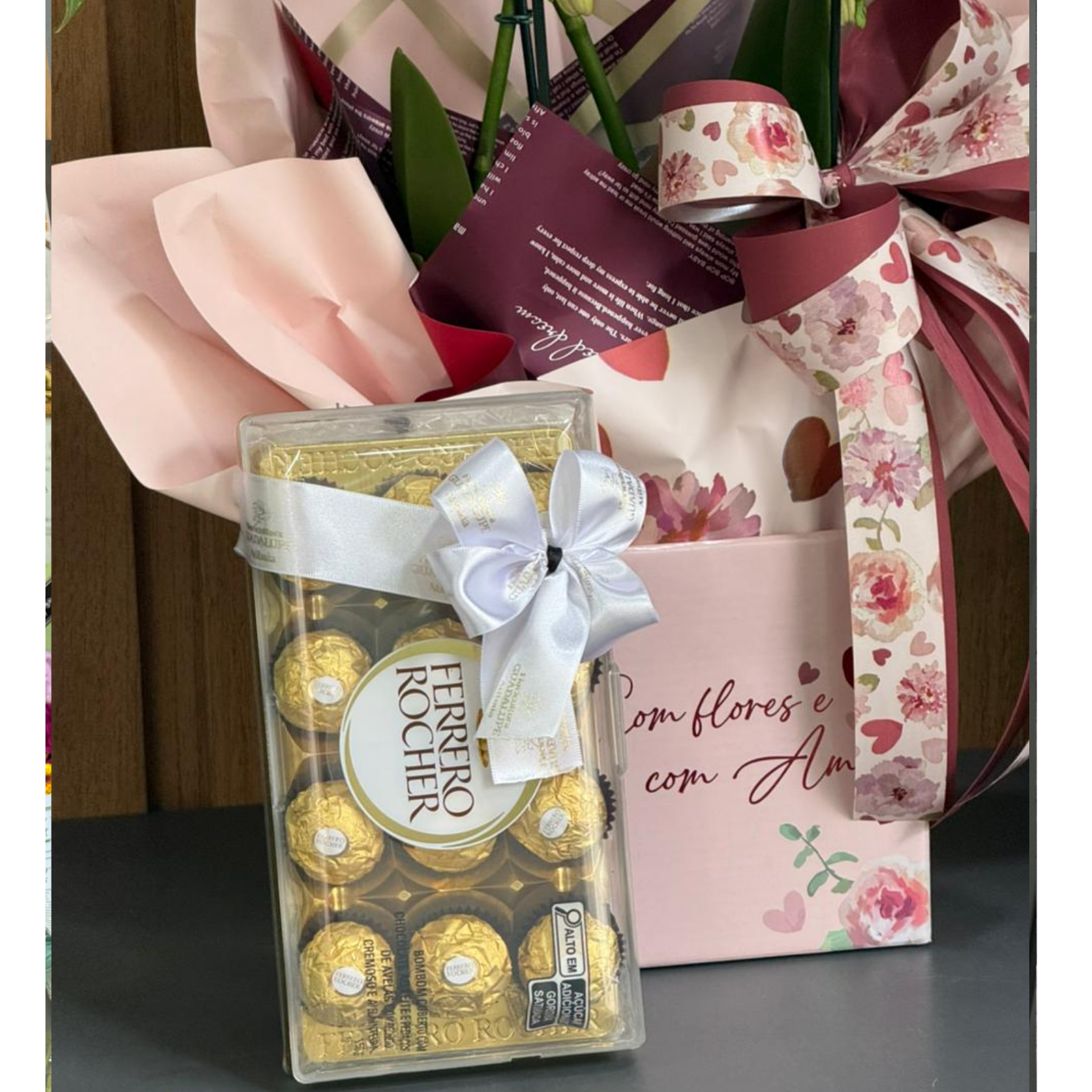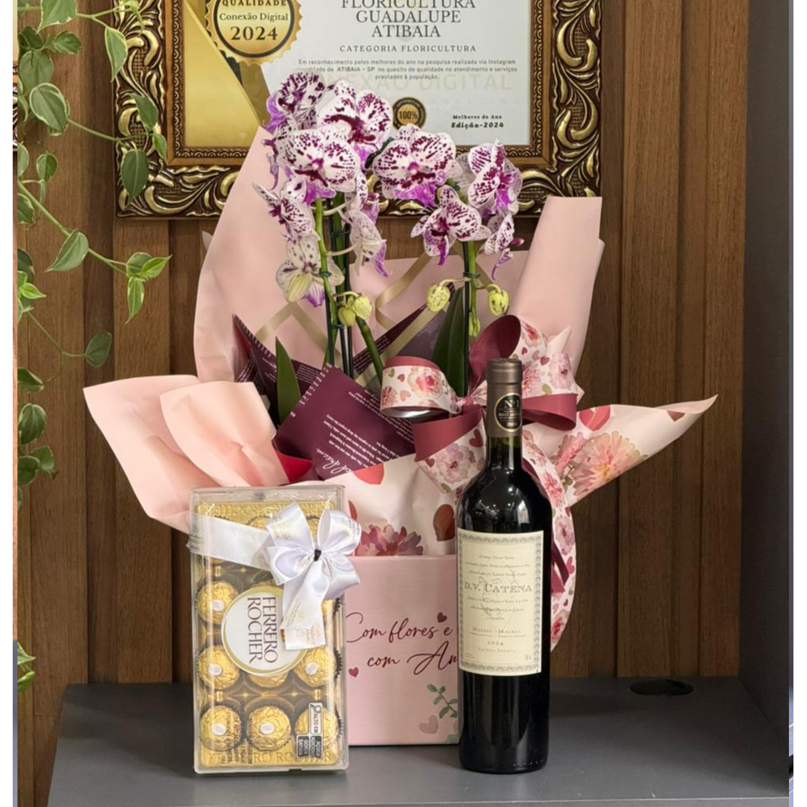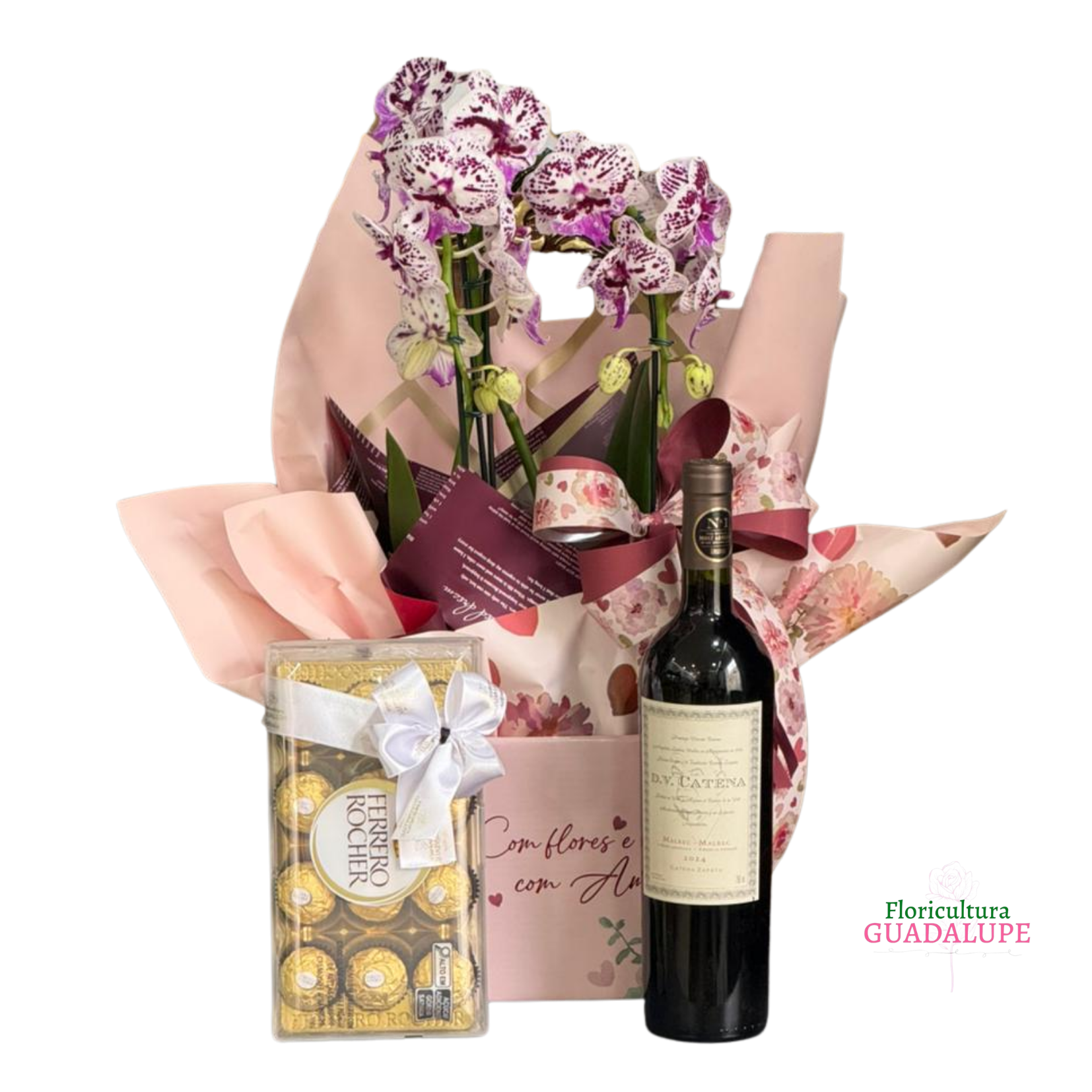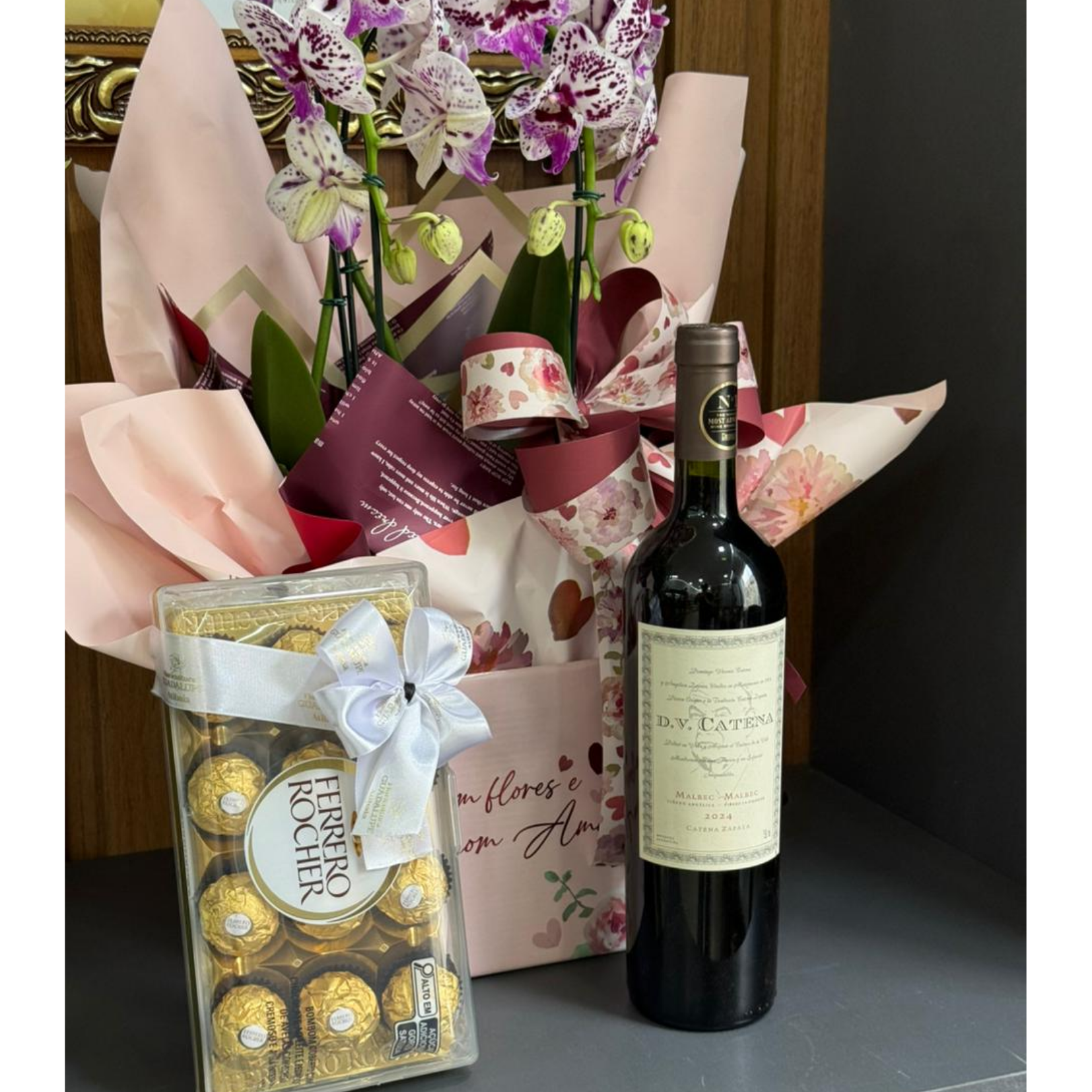 Kit premium composto por orquídea phalaenopsis em embalagem de presente, chocolate ferrero rocher 12un e Vinho DV Catena - Malbec-Malbec - safra 2024