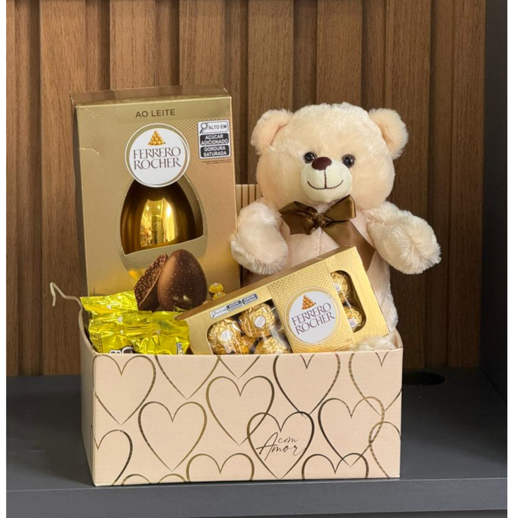 Mini box composto por ovo de páscoa ferrero rocher, pelúcia ursinho bombom ferrero rocher 8un e bombons ouro branco