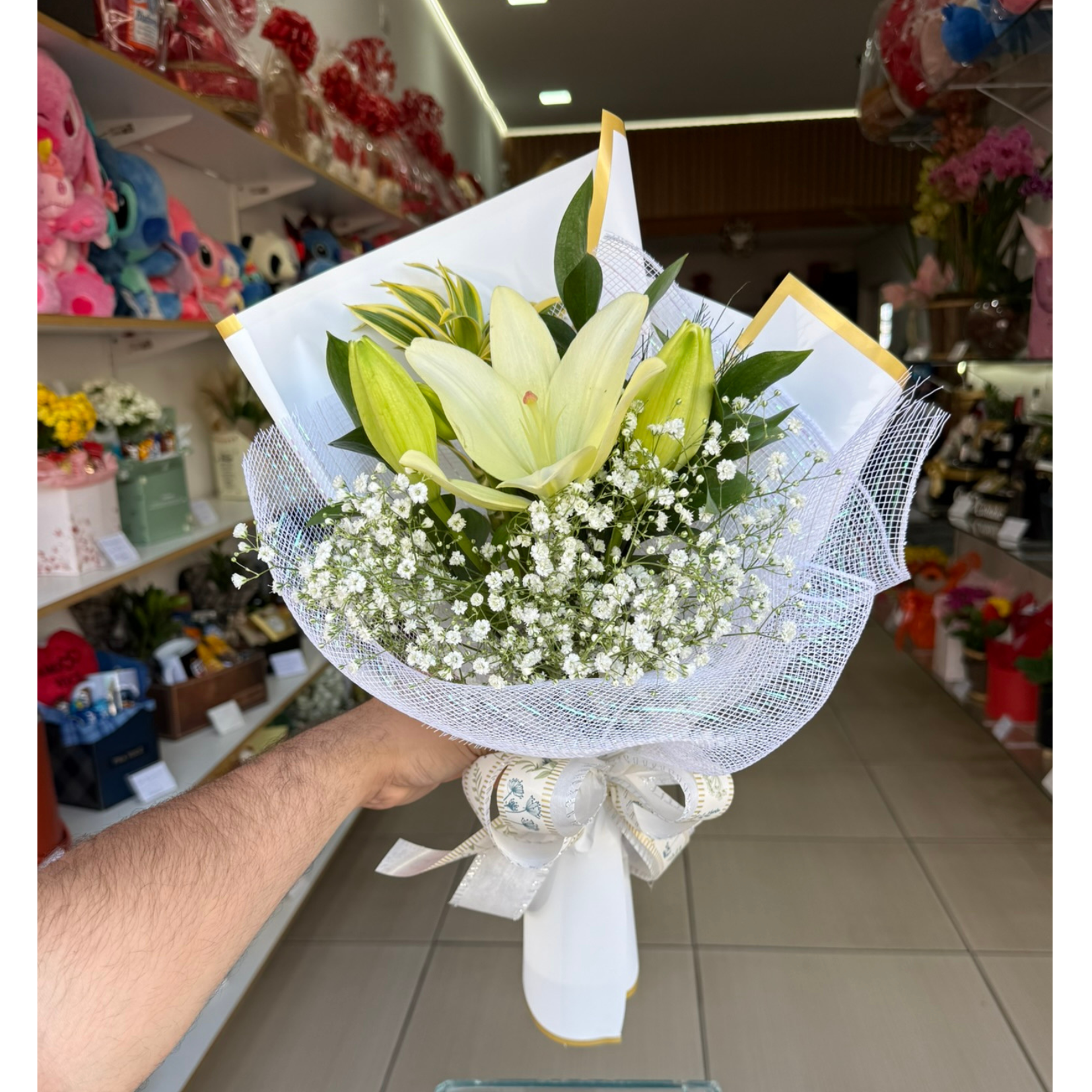 Mini buquê composto por lírio (cor disponível em estoque) e demais flores em embalagem tela de luxo