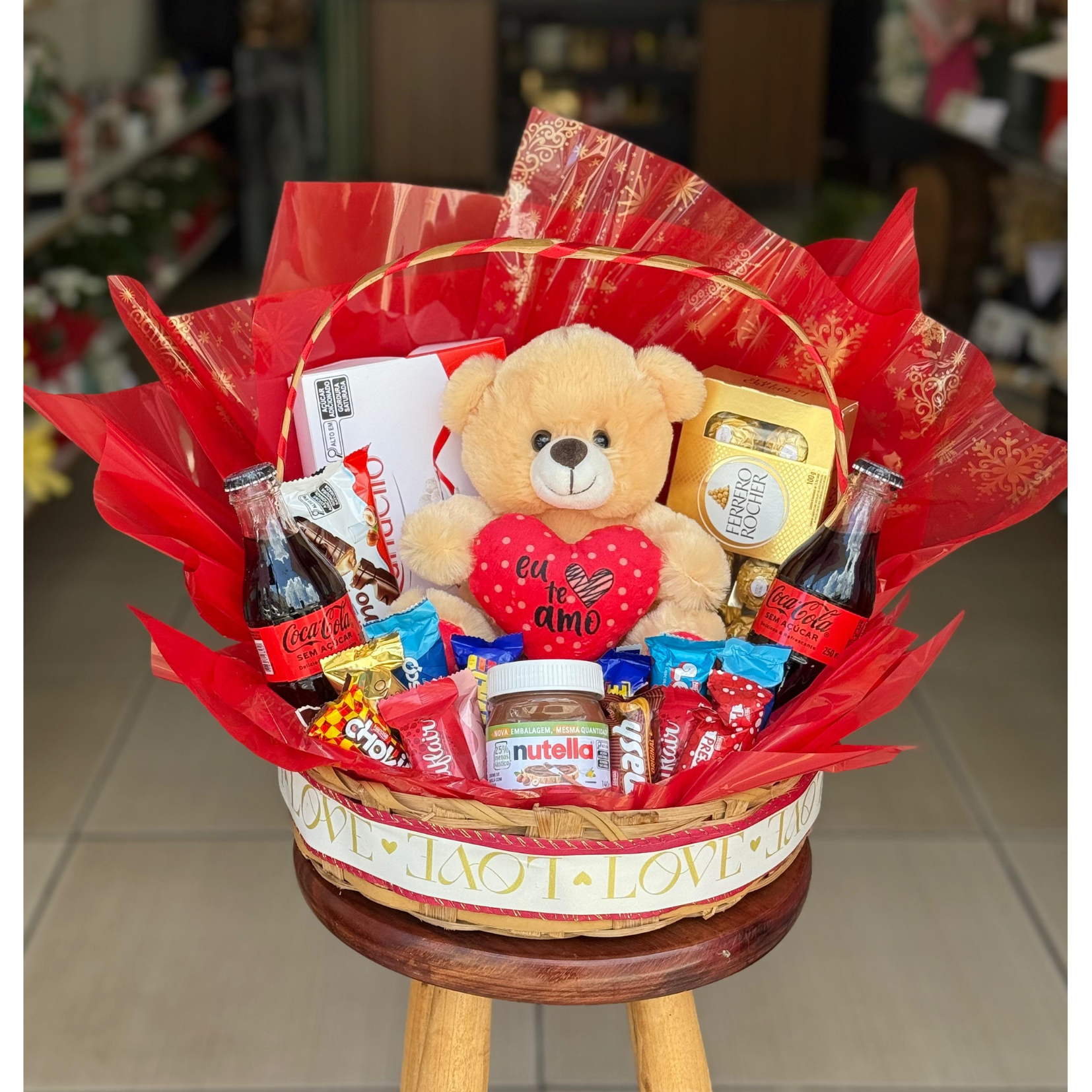 Cesta composta por pelúcia, 2 coca cola, rafaello rocher, ferrero rocher, kinder bueno, nutella e bombons sortidos